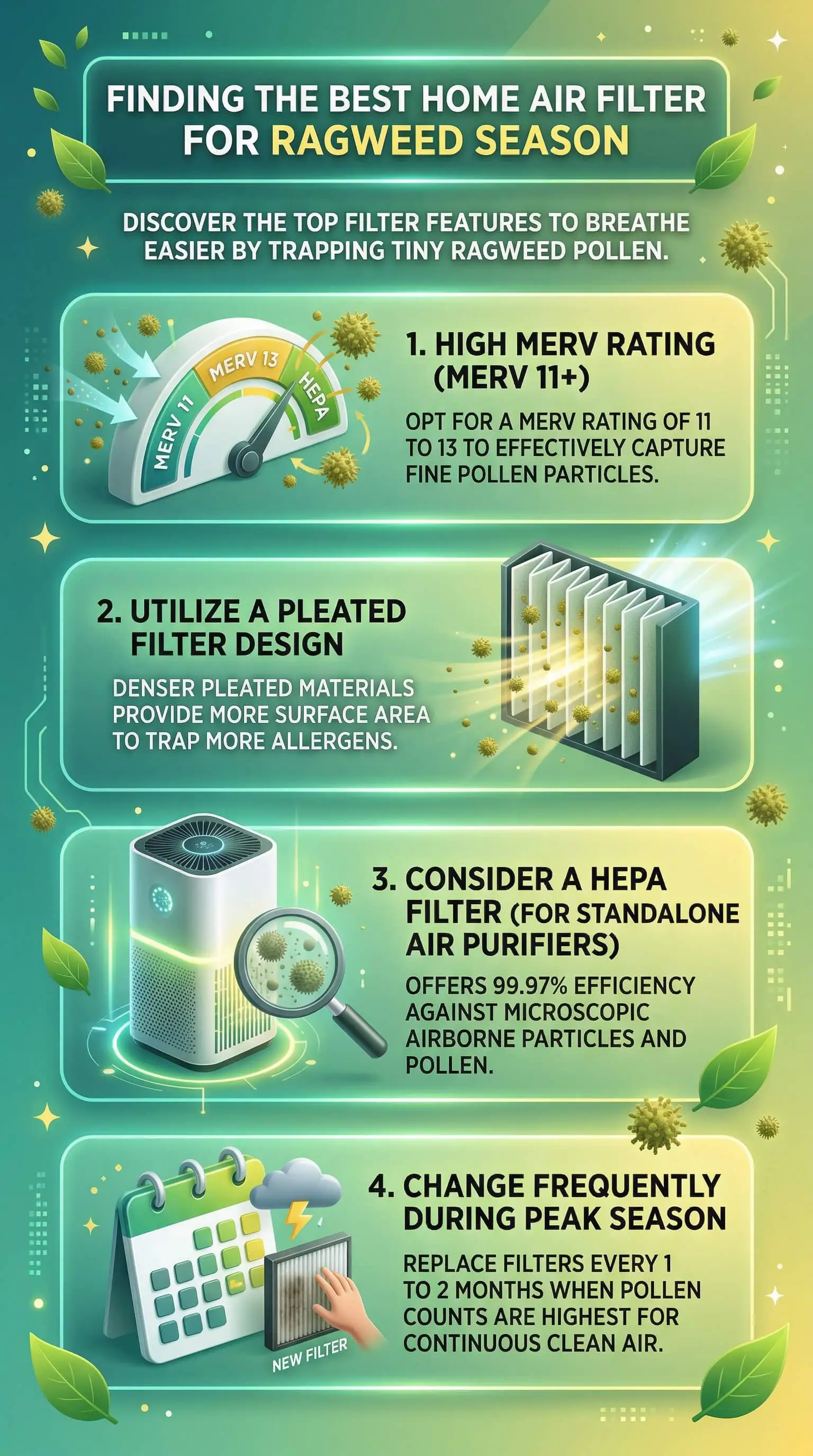 The best home air filter for ragweed season is a pleated MERV 11 or MERV 13 filter with electrostatically charged media. Here is what that means in practice: