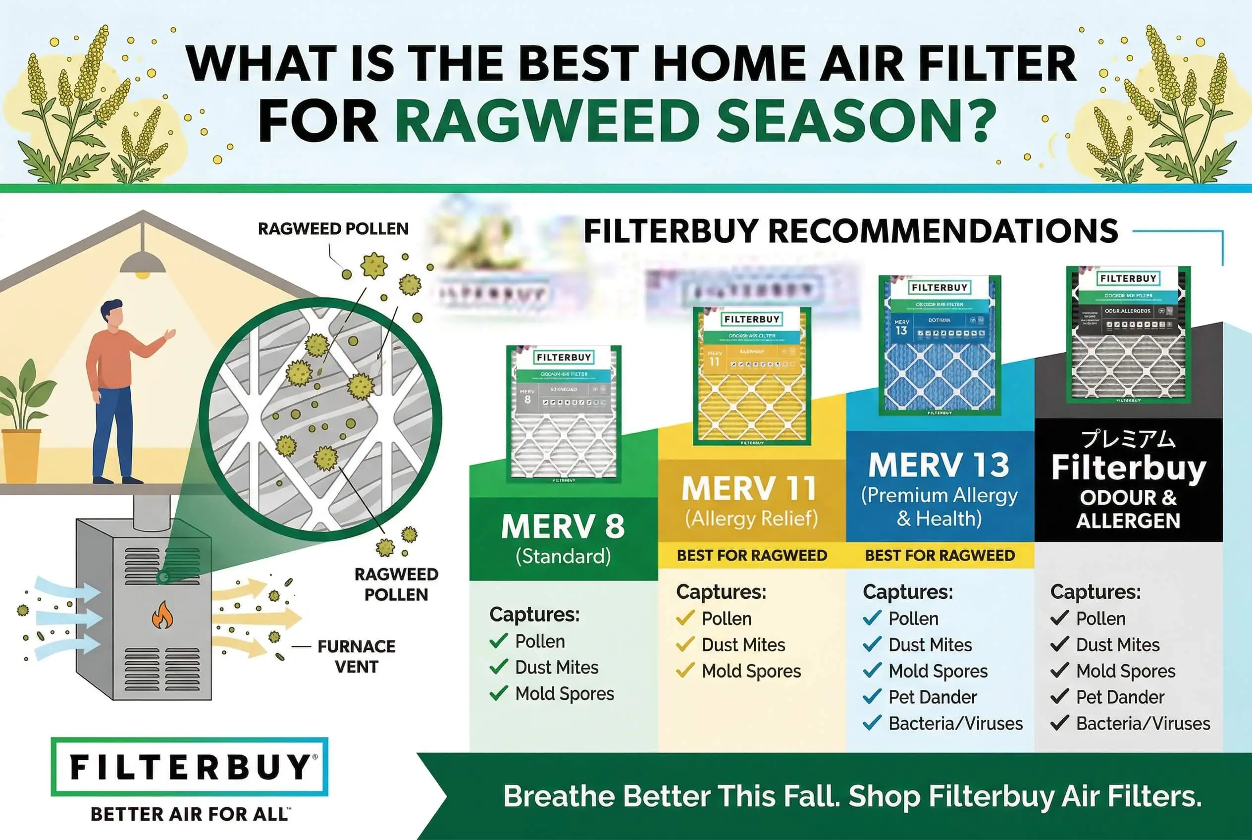 Ragweed season is predictable — your filter plan should be too. Shop Filterbuy's MERV 11 and MERV 13 pleated air filters, manufactured in the USA and delivered direct to your door before peak season hits.